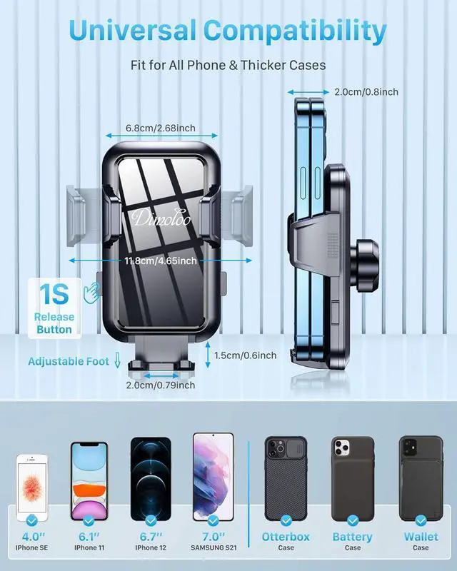 Dimoloo phone holder for car comes with clamp arms and adjustable feet. The clamp arms be extended up to 4.65 '' wide and the feet can be extended by 0.6 '', supporting all cell phones from 4 to 7''. The clamp arms are designed to warp inward, can hold up to thick phone cases ( 0.8 '', about 2 iPhones). So this cell phone car mount fits for almost all sizes of phones or phones with heavy/thick cases.