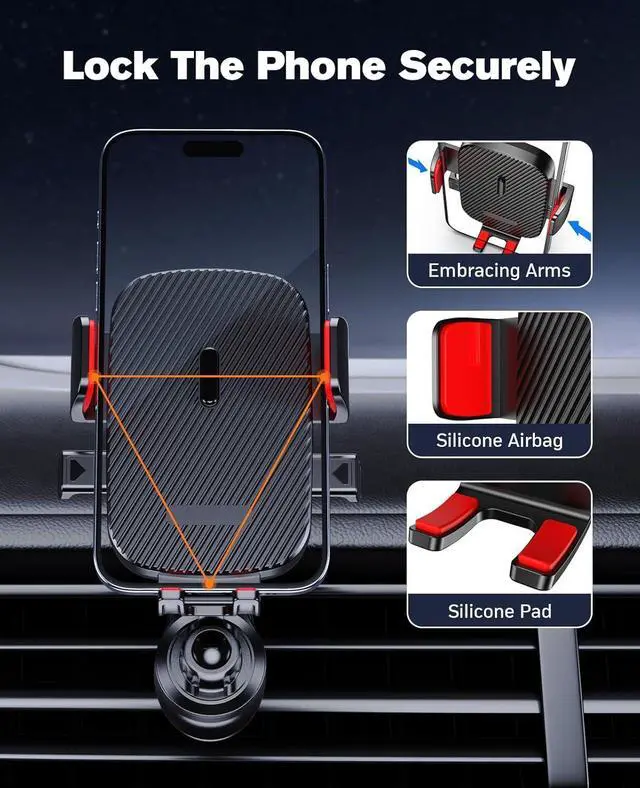 [Hold Your Phone Steadily]: This car phone holder clamp arm is designed to be semi-curved and equipped with upgraded non-slip silicone rubber pads (Red), which can firmly wrap the phone in the cell phone holder - even if the phone is turned upside down or driven on bumpy roads, it will not come off, so you can rest assured that your phone is placed in the NIYEVN phone holder