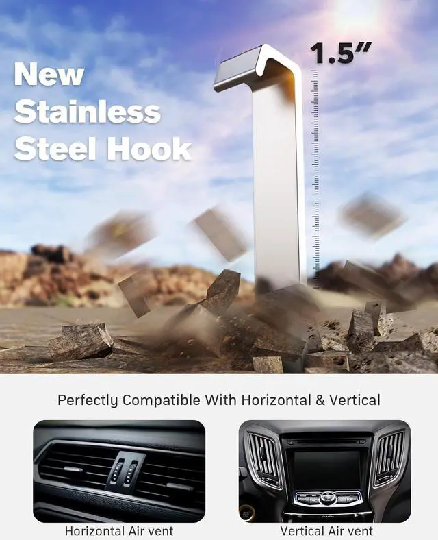 [Hook the Vent Stably & Never Falling]: This car phone holder mount is exquisitely made, the hook is made of stainless steel with a maximum extension of 38mm Durable. The hooks of the car cell phone holder form a stable triangular structure between the hooks and the vent, rock solid and unbreakable, suitable for most horizontal and vertical vents.