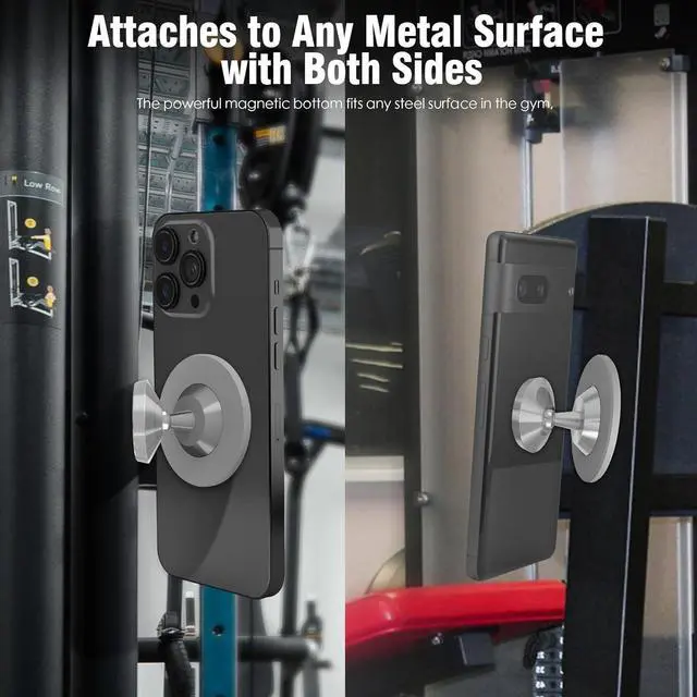 VERSATILE USAGE: Perfect for selfies and videos in the gym or anywhere with metal surfaces, including home, parks, and more! Plus, the included fixed iron plates make it possible to attach to non-metallic, smooth surfaces like glass and ceramic.