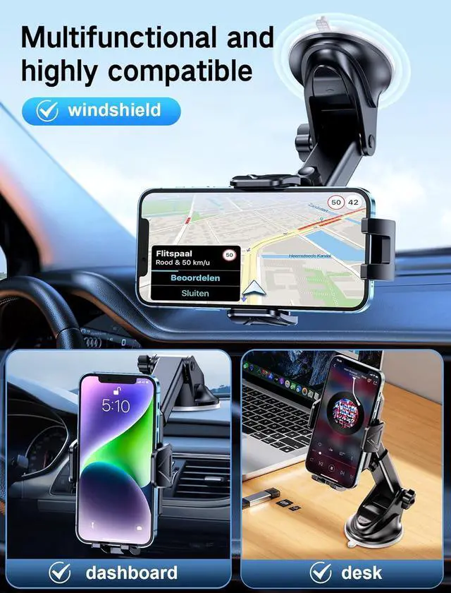 It Can Be Mounted Anywhere: whether on the dashboard, windshield or even on the desk, the possibilities are unlimited. This support cellulaire auto is suitable for all vehicles: cars, pick-ups, SUVs, trucks, taxis, etc. It's also a great helper for Uber drivers.
