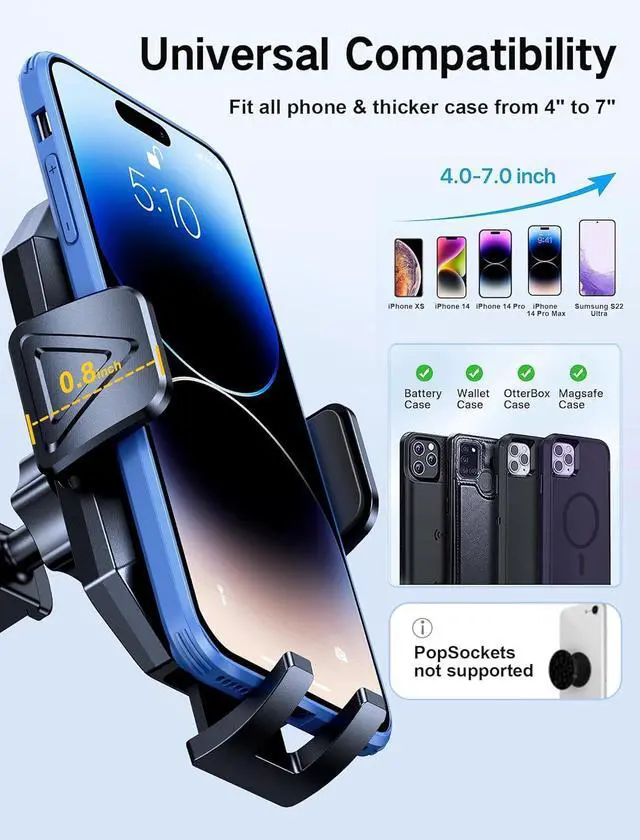 Wide Compatibility: The TSRYRLR car phone holder mount is compatible with 4-7 inch smartphones and most phone cases on the market with a thickness of up to 13mm.