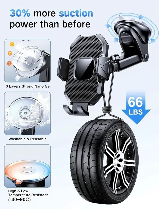 Super Strong Suction Cup: Adopting three layers of special waterproof gel vacuum suction cups, the new enlarged and thickened upgrade, the total suction power is 18% higher than the original, even at extreme temperatures, it will not melt and deform, and it will leave no traces, and it can be washed and reused, and the suction power is always stable.