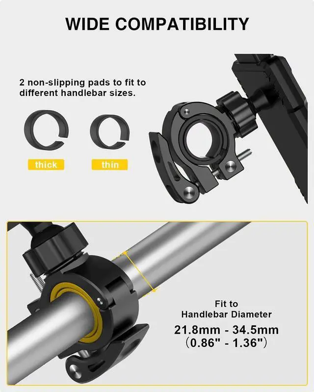 Universal Fits: coming with 2 non-slipping pads, this bicycle phone mount fits to handlebar diameter 0.86" - 1.36".