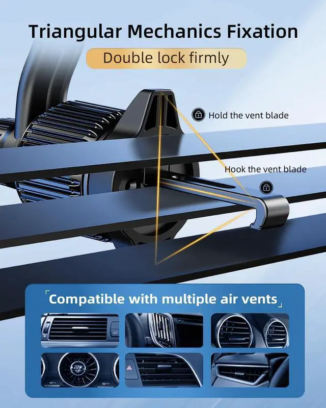 Strong Air Vent Clip This car cell phone holder features a "hook type" vent clip that forms a solid triangle with the baffle plate, which grips the vent blades tightly and ensures that it won't fall off under any circumstances. Its "Triple Grip Points" are made of anti-vibration foam and rubber to hold your phone more securely. Its compatible with most Horizontal & Vertical vents