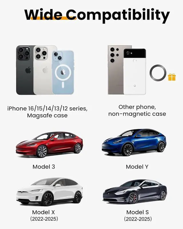 [Enhanced Compatible with All Phones]: The tesla model y phone mount offers a seamless attachment for iPhone 16/15/14/13/12 series. With the metal ring, other phones and non-magnet cases could use this tesla phone mount normally