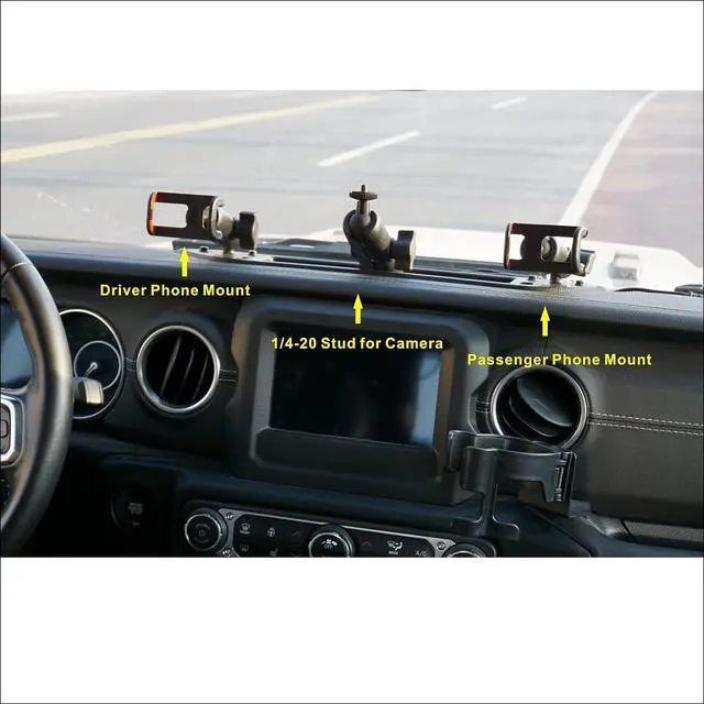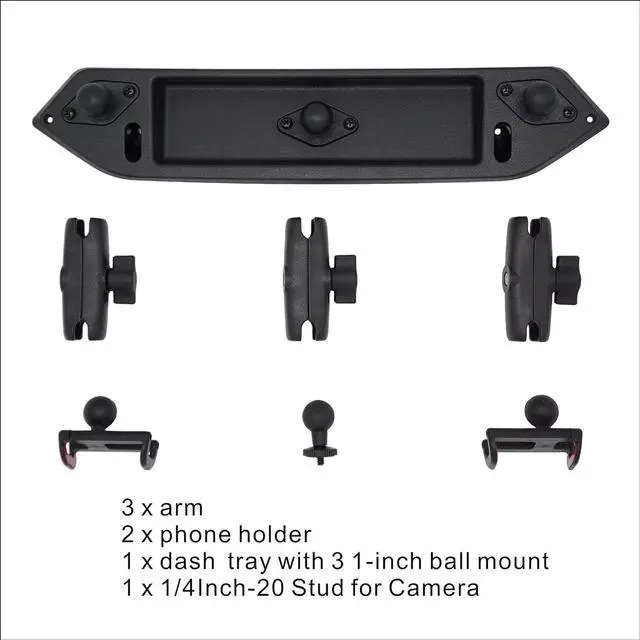 The phone mount pack comes with 1x dash ray, 2x phone holder, 3x arm, 1x 1-inch ball mount with 1/4 inch-20 Stud for Camera