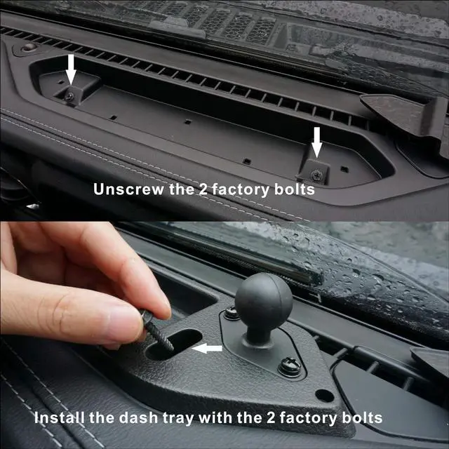 Install the dash tray with the 2 factory bolts. No trim No drilling