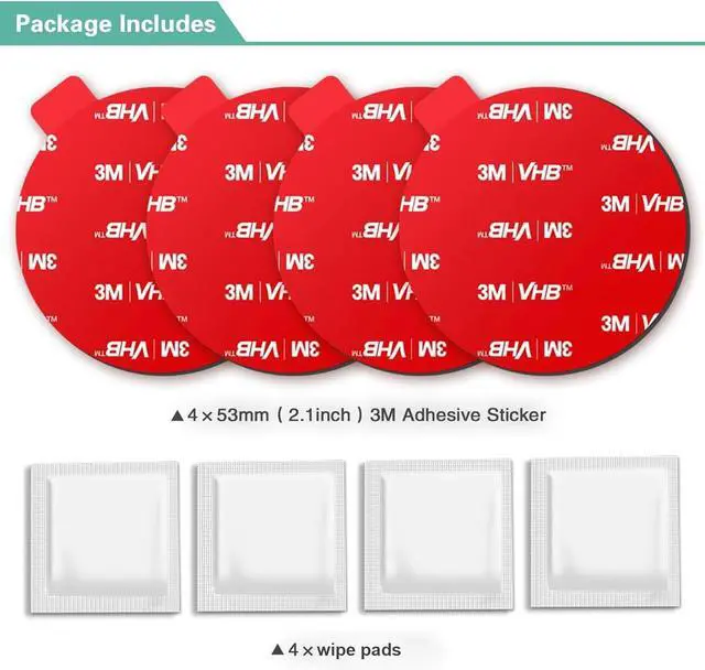 Wipe pads Provided - The auxiliary sticky replacements kit both sides also comes with wipe pads bulk to wipe the surfaces before applying. If you adhere the replacement kit to re-install over time you may need additional wipe pads for wiping surface. Make sure the mounting surface and mount base is wiped completely before attach the stickies parts adhesive tapes piece.