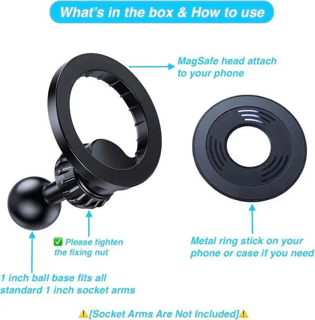 [What You Will Get] 1 Ball Base Magnetic Phone Mount for MagSafe x 1, Adhesive Metal Ring x 1. [Socket Arms Are Not Included]