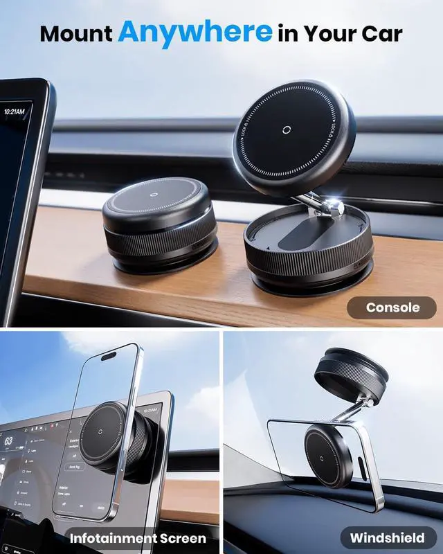 Flexible Angles, Compact Design Adjust your vacuum suction phone holder to any angle with 360° rotation and 270° tilt. Mount it on your cars console, infotainment screen, or windshield, or use it anywhere you need. When not in use, fold it flat for easy storage and easy to carry anywhere.