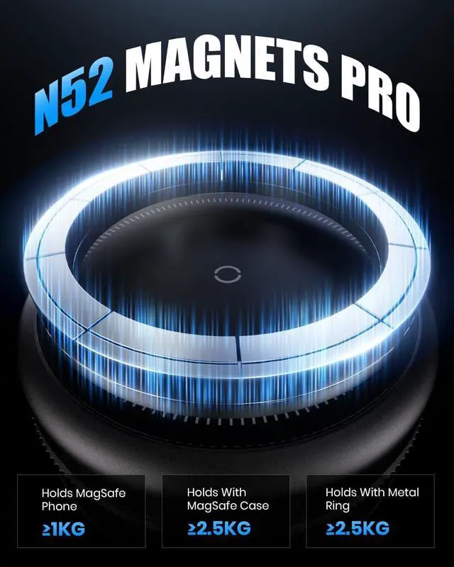 Strengthened Grip, Steady HoldThe vacuum magnetic phone holder uses N52 magnets with 1000GF pull force and strong suction to lock your phone tightly in place. It stays secure even on bumps, sharp turns, and sudden stops. Mount it on smooth surfaces, or use the round base for textured surfaces.