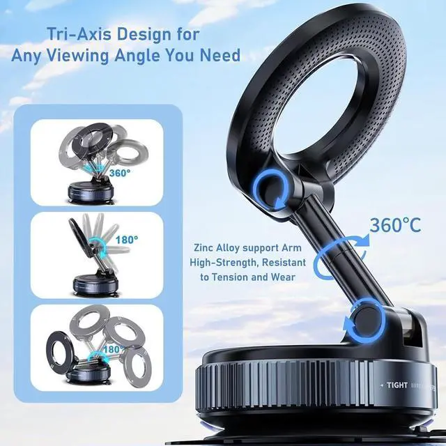 Multi-Angle Adjustment One-Touch Lock: Our magnetic phone holder features a unique dual axis folding metal arm that can rotate both 360 ° horizontally and 210 ° vertically making it easy to adjust any angle to meet your needs. Just turn the knob at the bottom to vacuum adsorb on any smooth surface. It is the best choice for content creators on social platforms such as TikTok Instagram and Red Note. Strong Magnetic & Strong Suction & Stable Hold: Our car phone holder uses advanced rotating-lock vacuum suction boosting suction by 50% compared to traditional press-on mountsand and does not require any adhesive. You no longer have to worry about leaving irremovable marks on your car windshield due to using a suction cup phone holder. This magnetic phone holder equipped with powerful N52 magnets provide top-level adsorption force up to 2400gf. After 8000+ vibration tests and extreme road condition simulations your phone will remain stable during bumps sudden braking or sharp turns.