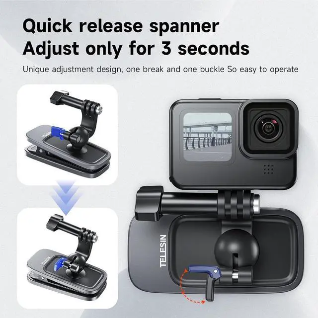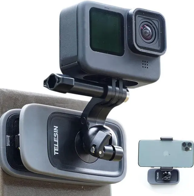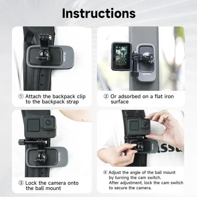 Magnetic Mount + Backpack Mount +Phone ClipThis is TELESINs latest magnetic backpack mount with phone holder, it functions a magnetic clip on metal surface and a bag backpack strap clip mount, multiple use mounting accessories for action camera and mobile.