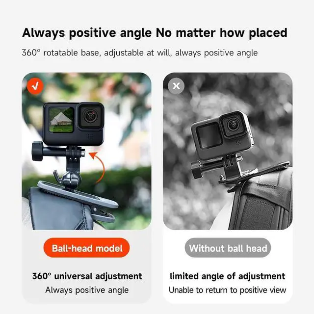 Strong Grip and Stable Made of high-quality ABS, installed with multiple rows of serrations and thick springs in the clip, perfectly fits with kinds of bag backpack strap, perfect POV selfie mount for traveling walking, outdoor surfing, parachute, hiking, skiing, snowboarding, climbing, biking, or other outdoor sports activities, free your hands!