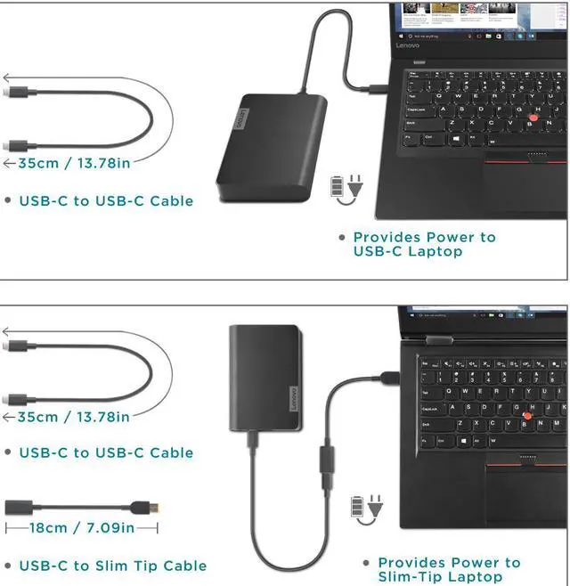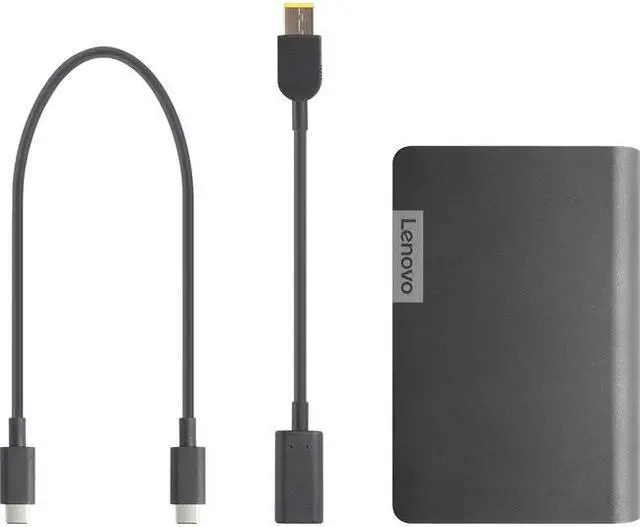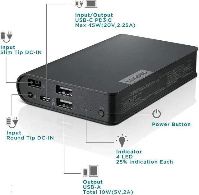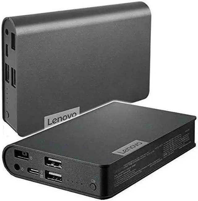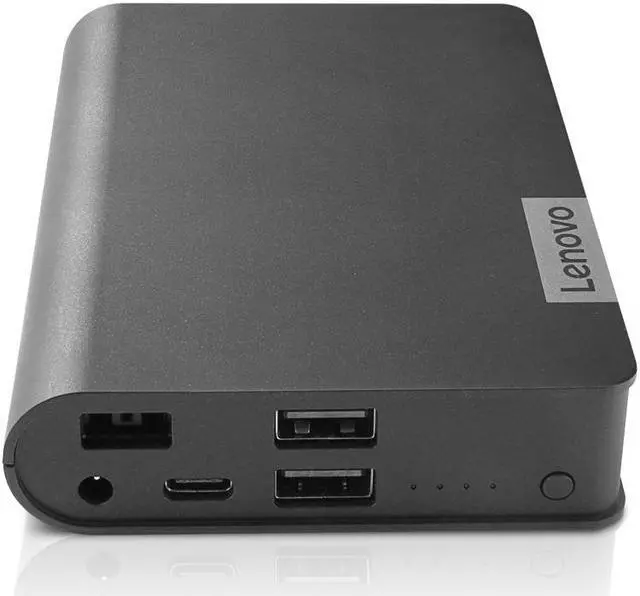 Bring extra power when you're on the move! Compatible with Lenovo and ThinkPad Slim-tip and USB-C powered notebooks the Lenovo USB-C Laptop Power Bank provides 48 Wh battery life (14000 mAh) to extend your notebook's life and your productivity. Featuring an additional two integrated USB-A ports the Lenovo USB-C Laptop Power Bank powers small mobile devices. While perfectly portable it also supports simultaneous charging - giving you the control to charge your notebook and power bank at the same time while on your workstations. 48 Wh battery performance (14000 mAh) Fast recharge time at less than 2 hours to fully charge 365 days long stand-by life Supports simultaneous charging between power bank laptop and phone Supports USB-C and Slim-tip laptops via dongle 2 USB ports for other mobile devices Perfectly portable at 0.64 lbs (290 g)