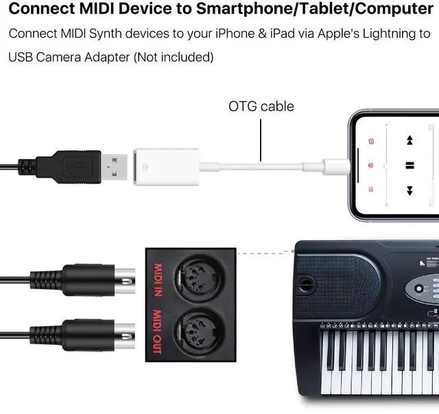 - Wide Compatibility - The 5-pin MIDI cable is compatible most computer operating systems such as Windows 10, Win8, Win7, Vista, Windows XP and Mac OS X and all MIDI compatible devices; Also for smartphones with adapters; Compatable with Apple iPad and iPhone, will need lightning to usb camera adapter (preferably with Apple OEM adapter)