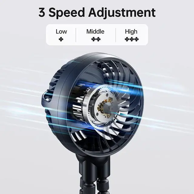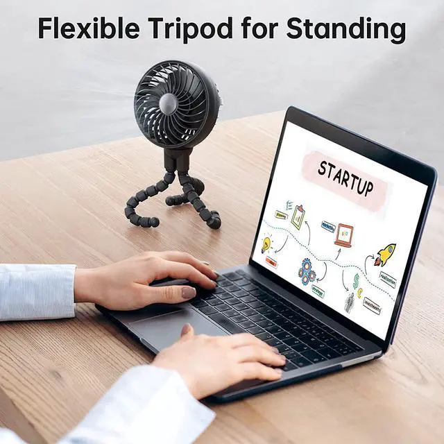 Portable fan with one button to switch between 3 speeds at any time you need and this flexible tripod fan is compact and lightweight, giving you impressive cooling anywhere.