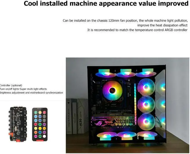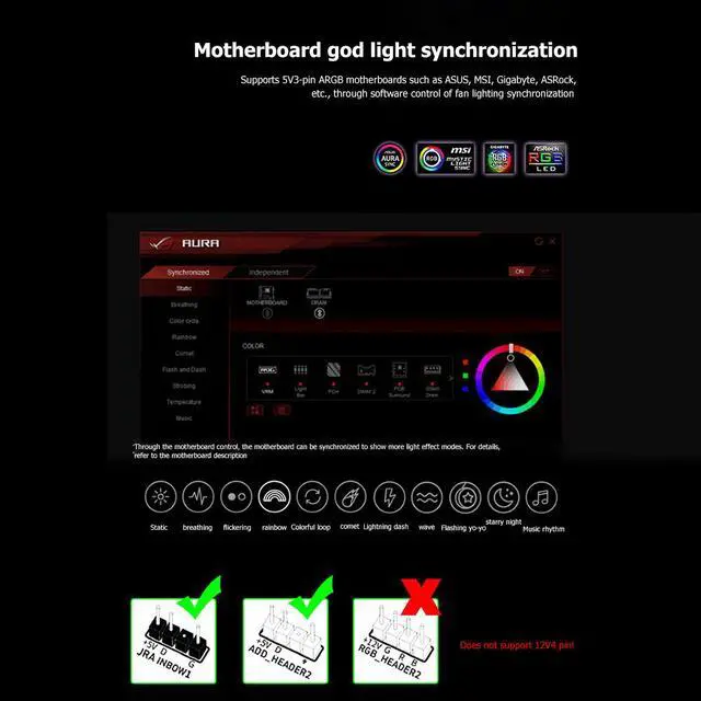 2. Support 5V 3-pin ARGB motherboards such for ASUS, MSI, Gigabyte, ASRock, etc., and control the fan lighting synchronization via software.