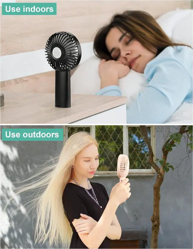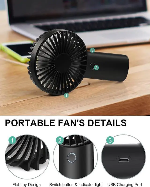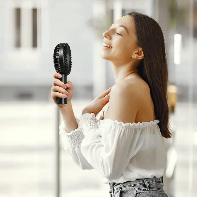 STRONG WIND & COOLThis handheld fan has the newest copper motor with 3 speeds available. Portable fan is very easy to use, you can just press the power button to switch the fan speed at will. A personal fan can spin up to 4300 RPM, which can bring strong wind to keep you cool and comfortable on hot summer days.