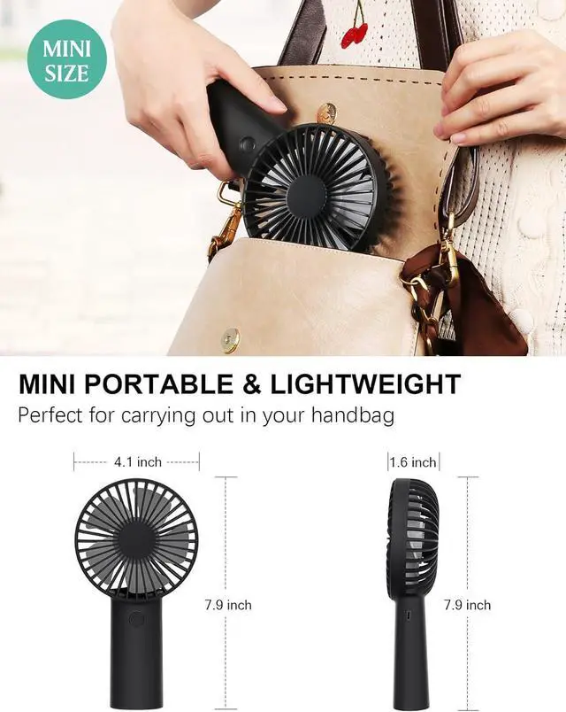 MINI HANDHELD SIZE Hand held fan is small ( 7.9" long, 4.1" wide, 1.6" height, Weight: 0.64 lb) and fits nicely in your hand or in your handbag, backpack, you can take it with you all summer long. If you're in an office, you can also place the fan upright or angled on a desk, which can make you cool when you are working.