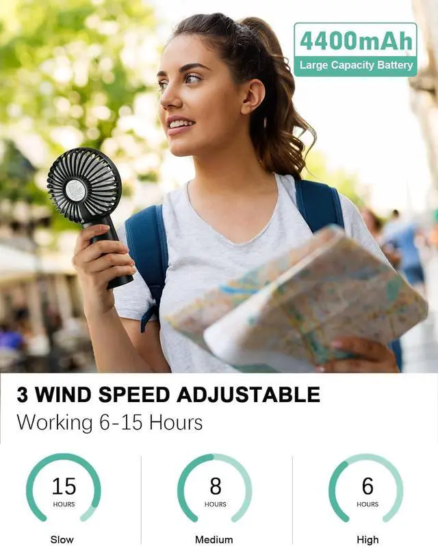 LARGE CAPACITY STORAGE 4400mAh large capacity portable fan consists of 2*2200mAh batteries, which can provide 6-15 hours long working time (depends on your speeds). These batteries are rechargeable and longevity, keeping it working for 6 hours even at top speed. Handheld portable fan is an ideal lifesaver for your hot flashes in summer anywhere.