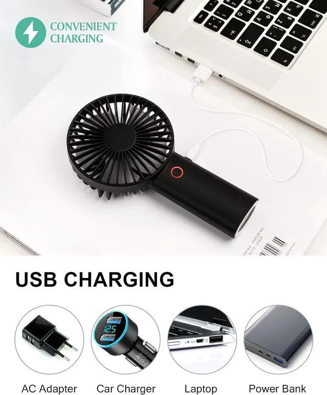 MULTI-WAY CHARGINGHandheld travel fan is compatible with charging cables for all USB output devices, such as USB chargers, laptops, computers, power banks, car chargers. You can use it anytime and anywhere without worrying about running out of power, just enjoy its cooling.