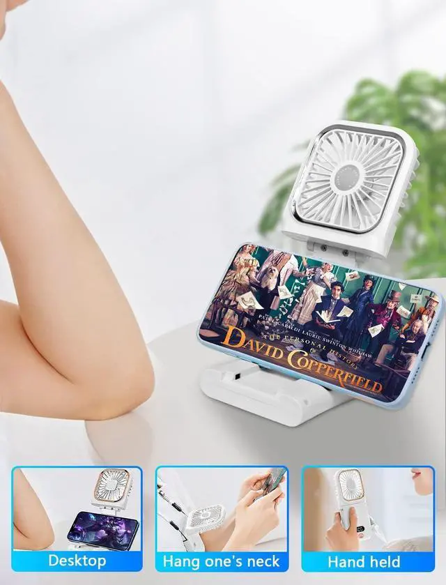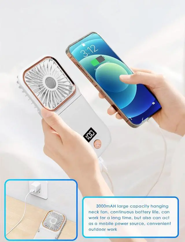 Adjustable SpeedThis small fan has 3-level wind setting to adjust the wind speed. Giving you a comfortable cooling experience in hot days, Handheld fan, Desktop Fan and Neck Fan as a mobile phone holder. FINEDAYS handheld fan with 3000mAh power bank comes to solve this problem for you. This is a fan design brings convenience for girls, boys, sporters, teenagers, office workers, and so on. You can charge your phone, simultaneously enjoy the cooling air. Worthy to own one.