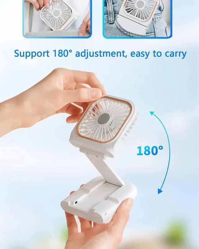 180° Rotatable Fan and Portable Lightweight DesignHandheld, Hanging Neck and Table fan. You can hold it at hand, hang it on your neck with a lanyard (included), frees your hand when you need to hold a phone and other stuff. Besides, you can also fold it and put on the table as a desk fan, The small USB fan supports 180° rotation makes you get airflow from different directions so that keep you cool in any angle. it will not take up too much space and weight when putting it in a backpack.