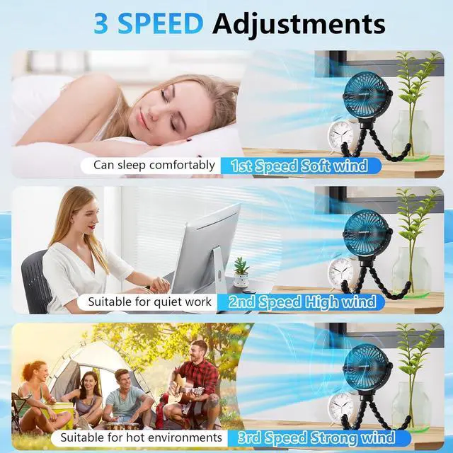 Multipurpose Stroller Fan: The mini fan comes with a flexible 360° swivel tripod, making it versatile and easy to clip onto most strollers, cribs, wheelchairs, car seats, and more
