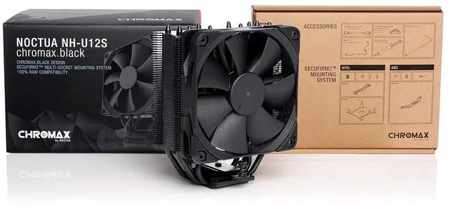 The NH-U12S chromax.black is an all-black version of Noctuas NH-U12S premium-quality quiet CPU cooler. Thanks to the same proven slim-tower heatsink design and NF-F12 PWM fan, it stays true to the NH-U12Ss successful formula of fusing excellent cooling performance with superb quietness of operation and outstanding RAM, case and PCIe compatibility. At the same time, the chromax.black version with its black fan and black coated heatsink combines these assets with a sleek stealth look. Topped off with the renowned SecuFirm2 multi-socket mounting system and Noctuas enthusiast-grade NT-H1 thermal compound, the NH-U12S chromax.black is a premium choice for customers who seek a highly compatible 120mm heatsink that looks just as great as it cools.