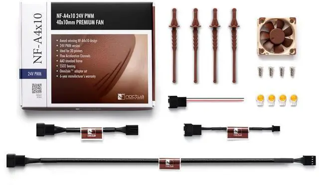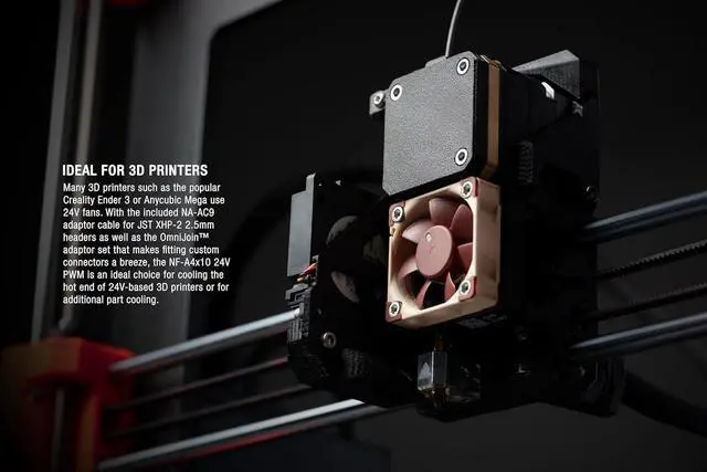 • 24V version of Noctuas award-winning quiet 40x10mm fan, ideal upgrade/replacement 4cm fan for 3D printing (hot end or part cooling) and other 24V applications; 5000rpm max., 4-pin PWM connector for automatic speed control via 4-pin PWM fan headers (maximum airflow performance when required, near-silent at lower speeds); NA-AC9 adaptor cable for popular 3D printers with JST XHP-2 2.5mm headers (e.g. Creality Ender 3 & CR-10, Anycubic Mega), ideal to improve printing performance and quietness of operation; Includes anti-vibration mounts, fan screws, extension cable, Low-Noise Adaptor (LNA), NA-AC9 adaptor and OmniJoin adaptor set for connecting the fan to proprietary fan headers; Trusted Noctua quality with premium-grade SSO2 bearing (MTTF > 150,000 h), safety certifications from UL and TÜV, protected against reverse polarity, over voltage and over current (short-circuits)