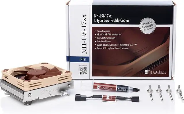The NH-L9i-17xx is the latest revision of Noctuas award-winning NH-L9i low-profile CPU cooler for Intel LGA1700 or LGA1851 based HTPCs and Small Form Factor (SFF) systems. At a height of only 37mm, the NH-L9i is ideal for extremely slim cases, and due to its small footprint, it provides 100% RAM and PCIe compatibility as well as easy access to near-socket connectors even on tightly packed mini-ITX motherboards. The custom-designed SecuFirm2 mounting system for the LGA1700 and LGA1851 sockets makes installation a breeze, and thanks to the highly optimised NF-A9x14 92mm fan that supports fully automatic speed control via PWM, the NH-L9i-17xx runs remarkably quietly. Topped off with Noctuas renowned NT-H1 thermal compound, the NH-L9i-17xx combines everything users have come to expect from Noctuas larger coolers into a super-compact, premium-quality package for mini-ITX and HTPC builds with Intel LGA1700 or LGA1851 CPUs.