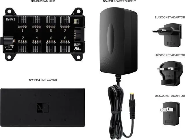 Combining the NV-FH2 8 channel PWM fan hub with the NV-PS1 230/115V 24W power supply, the NV-SPH1 powered hub set is the ideal solution for powering up to eight 12V fans off the mains for home, office or multi-purpose ventilation applications. For stepless speed control of PWM fans, the optional NA-FC1 controller can be connected to the 4-pin input of the NV-FH2, and if more than eight fans are required, additional NV-FH2 hubs can be daisy-chained. Both the NV-FH2 and the NV-PS1 carry CE, UKCA and UL certifications, are fully compliant with all applicable safety standards. In short, the NV-SPH1 is a complete premium set for powering multiple 12V fans from wall outlets and can be easily expanded with the optional NA-FC1 controller as well as additional NV-FH2 boards.