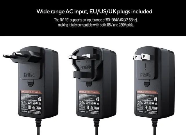 Output connectors8x 4-pin PWMInput connectors1x 5.5mm (outer diameter) / 2.1mm (inner diameter) barrel connector, 1x 4-pin PWMMax. power via barrel conector60 WMax. power via 4-pin PWM input22 WOperating voltage5-24 VOperating temperature-40°C to +60°CFlammability classUL-94 V-0Safety standardsEN 62368-1, EN 55035, EN 55032, UL-62368CertificationsCE, UKCA, ULSize93x62x12.5mm (without cover) / 93x62x19mm (with cover)Weight47 gFan compatibilityAll Noctua 24V, 12V, and 5V fans, many third party fansInput voltage90~264 V ACInput frequency47~63 HzStandby power consumption0.075 WProtectionOver voltage, over current, short-circuitsProtection classIIOperating temperature0~40 °COperating humidity8~90 %Safety standardsEN 60950-1:2006+A11+A1+A12+A2, EN 62368-1, IEC 62368-1:2014, UL 60950-1 (2nd Edtion), CAN/CSA C22.2 No. 60950-1-07 (2nd Edition)EMC standardsEN 55032 Class B, FCC Part 15 Subpart B Class BInput connectors (included)type C (CEE 7/16, for Europe, Russia, Brazil, South Africa, etc.), type A (NEMA 1-15, for USA, Canada, Mexico, Japan, etc.) and type G (BS 1363, for UK, Ireland, Singapore, etc.)Output connector5.5mm (outer diameter) / 2.1mm (inner diameter) barrel with NA-AC10 4-pin PWM adaptor cableCable length1.5 m