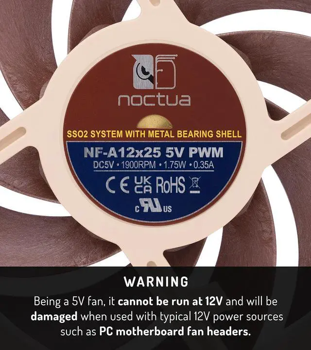 The NF-A12x25 5V PWM is a PWM-enabled 5V variant of Noctuas award-winning, premium-quality NF-A12x25 120mm fan. Featuring an AAO (Advanced Acoustic Optimisation) standard frame and sophisticated aerodynamic design measures such as Flow Acceleration Channels, the NF-A12x25 is renowned for its superior performance and outstanding quietness of operation. Smooth Commutation Drive technology and Noctuas reference class SSO2 bearing assures superb running smoothness and excellent long-term stability. Topped off with the included USB power adaptor cable and OmniJoin adaptor set, the NF-A12x25 5V PWM is a premium choice for demanding 5V applications that require PWM control.