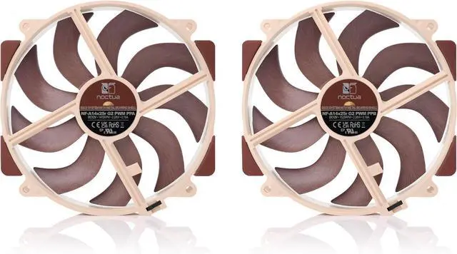 The NF-A14x25 G2 features a unique Progressive-Bend impeller with Flow Acceleration Channels and winglets. Its nine blades are swept backwards close to the hub and progressively bent forward further out. Working in tandem with the Centrifugal Turbulator hub, this design not only helps to push more air towards the outer blade areas where efficiency is higher but also assures maximum lift and near uniform loading across the entire blade span.