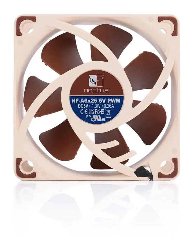 Featuring advanced aerodynamic design measures such as Flow Acceleration Channels and an AAO frame, the NF-A6x25 5V PWM is a PWM-enabled 5V variant of Noctuas highly optimised, premium-quality quiet 60x25mm fan. The custom-designed NE-FD1 PWM IC that integrates Smooth Commutation Drive technology and Noctuas reference-class SSO2 bearing ensure superb running smoothness and excellent long-term stability. Topped off with modular cabling and the OmniJoin Adaptor Set, the NF-A6x25 5V PWM is a premium choice for demanding 5V applications that require PWM control.