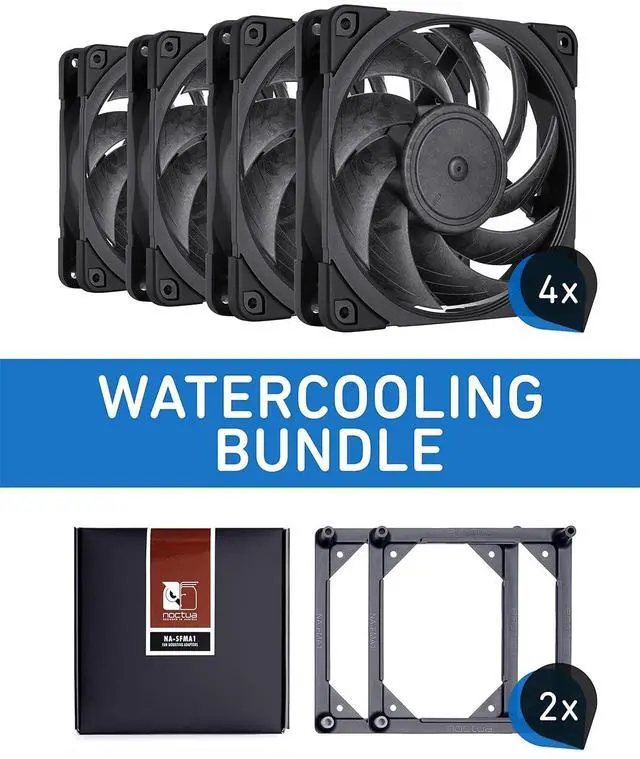 Next-generation NF-A12x25 PWM chromax.black.swap 120mm fan provides unprecedented quiet cooling performance on DIY and AIO (all-in-one) water coolers, outperforms most 140mm fans; NA-FMA1 adaptors make it possible to install the near-silent NF-A12x25 fans on radiators that are designed for 140mm fans; vibration-free installation with included NA-AV4 silicone mounts; Bundle includes 4x NF-A12x25 PWM fans and 2x NA-SFMA1 sets (4 adaptors) for equipping 280mm (2x 140mm) radiators in push-pull configuration or 560mm (4x 140mm) in push configuration; Ideal push-pull upgrade for popular 280mm AIO units (e.g. Corsair H110, H110i, H115 or H115i series, NZXT Kraken X62, Cooler Master Nepton & MasterLiquid 280, Enermax LiqTech 280, etc.); Trusted Noctua quality backed up by 6-year manufacturers warranty