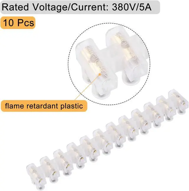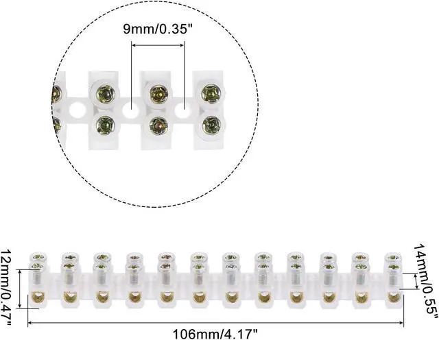 Total Size: 106mm x 14mm x 12mm/ 4.17 inch x 0.55 inch x 0.47 inch (L*W*H) In the package of 10 x barrier terminal blockAre there any advantages of the product? It is made of brass conductors, with great electrical conductive and reliability. How to use it? Loose the screw, insert the wire into the conductor hole, then fasten the screws to hold tightly. What should I notice? When wiring, be sure to disconnect the power; Do not use it in the case of exceeding the rated voltage or current.