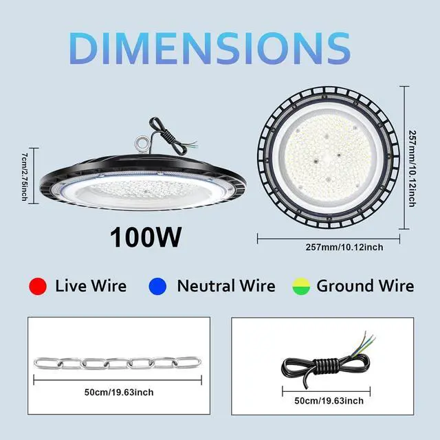 Easy to Install and Widely UsedThe round back of the saucer warehouse light allows you to fix the LED indoor spotlight to the wall, ceiling or floor with hooks or chains (hooks not included). The LED saucer spotlight is suitable for all locations where high brightness is required. For example. Workshops, warehouses, garages, basements, gyms, supermarkets, gymnasiums, logistics companies, restaurants, etc.