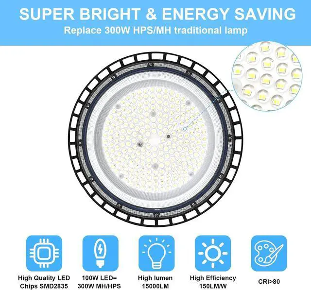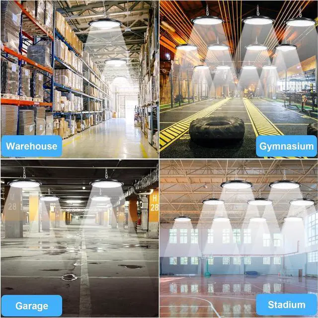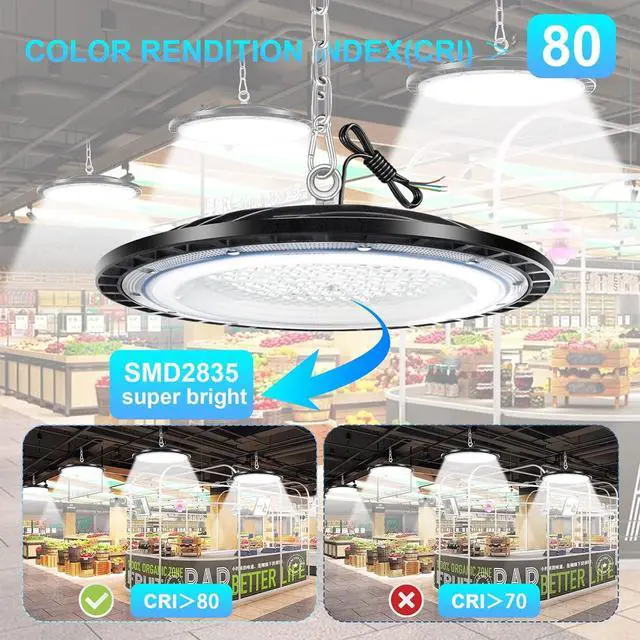 Super Bright and Energy SavingOur LED UFO high quality bay light uses high quality LED beads to provide bright lighting. 150W high quality bay light uses 216pcs high quality SMD 2835 LED chips with high brightness and high colour rendering index, several times brighter than traditional bulbs. 120° large illumination angle. Low power consumption and low heat, saving over 85% compared to incandescent and halogen lamps.