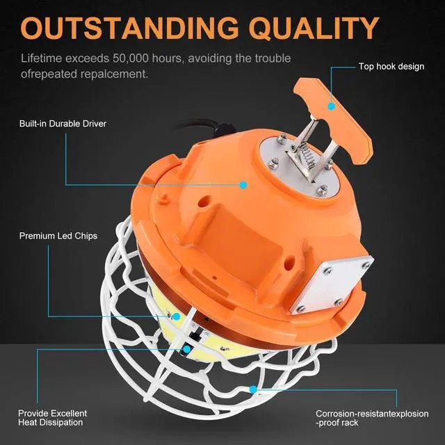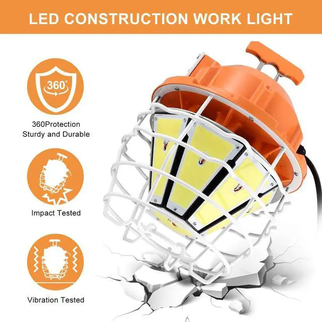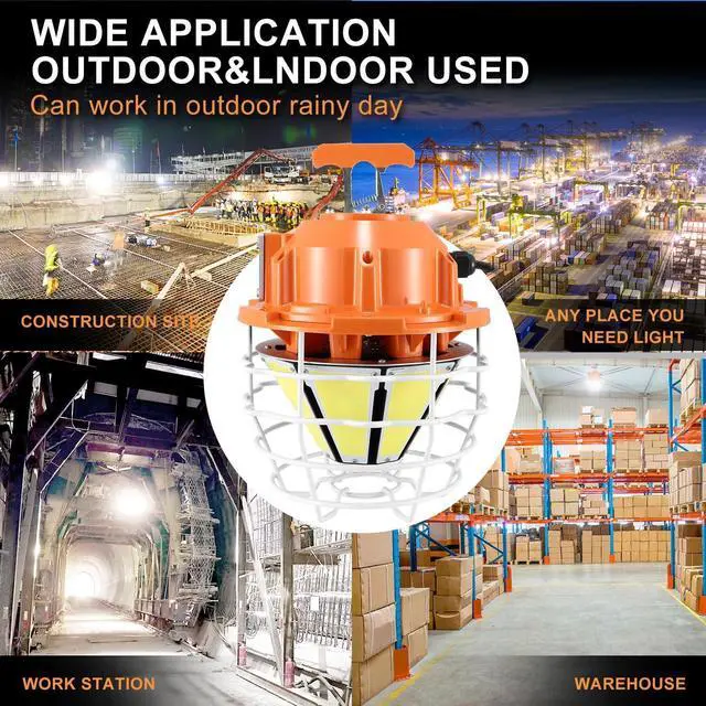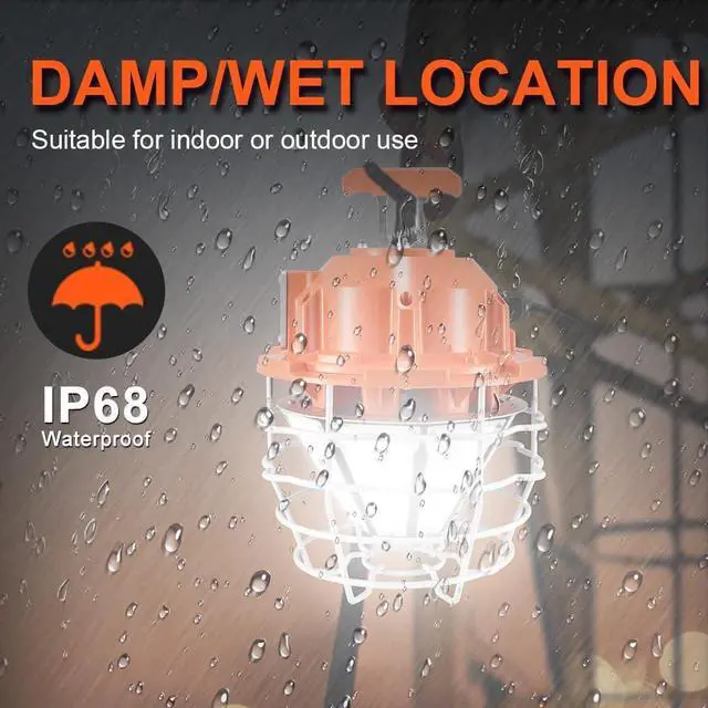 Durable Construction: A stainless steel protective cage adds extra durability and protection to the LED temporary work light, designed to absorb shocks, vibrations, and withstand rough use. It is IP68 waterproof and wet-location rated, suitable for outdoor use even on rainy days.