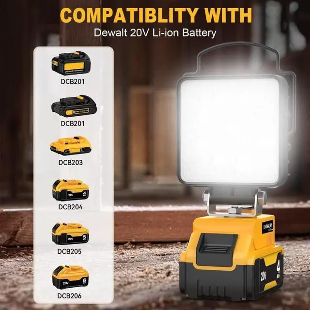COMPATIBILITY WITH BATTERYFor Dewalt 18V/20V Lithium-ion Batteries DCB206 DCB205 DCB204 DCB181 DCB182 DCB200 DCB203 DCB205-2 DCB204-2 DCB206-2 and More. All you need is your batteries to power the cordless LED light!