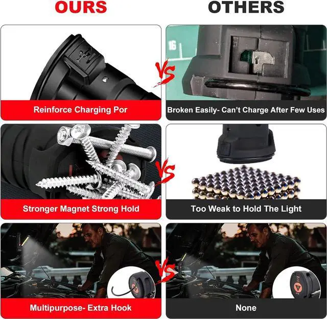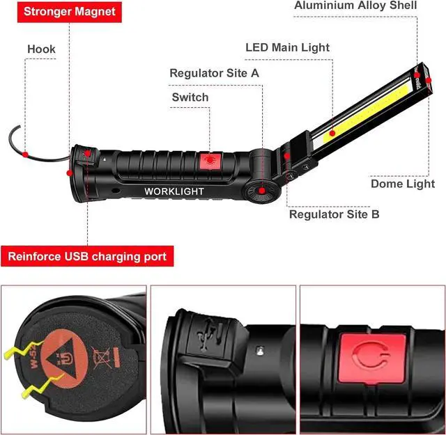 Upgrade Super Strong Magnet Base&Reinforced charging port The magnetic bottom has a strong hold and the magnetic lights could be stuck to any metal steel, they will hold in place when working in tight spaces. The bottom of the charging port is lengthened, not easy to fall off, solving the trouble of not charging