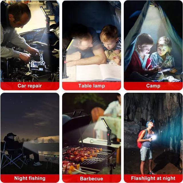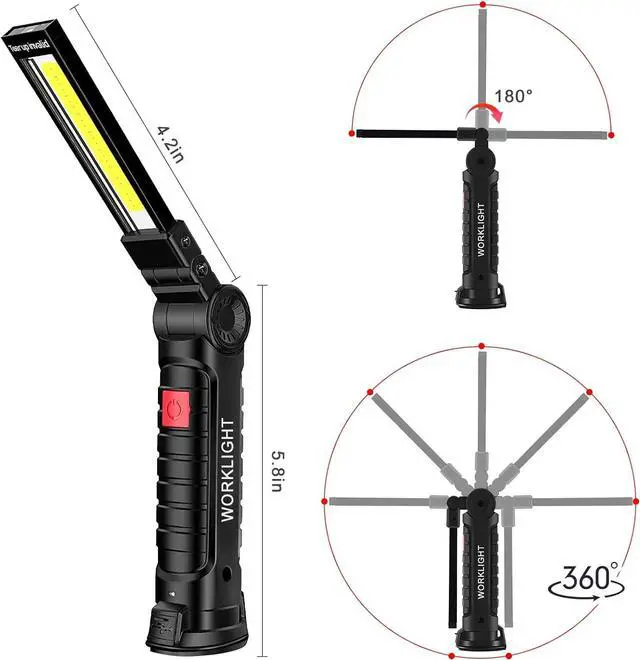 Durable Material&Portable work lightThis led work lights is made of hard rubber, anti-sweat and anti-slip, the head is aluminum which dissipates the heat effectively, prolong the life of the lamp. Foldable design, the magnetic light is easy to carry and it is small when folded and can be placed in a shirt or pants pocket. Great for car repair, home lighting, camping, hiking, power outages, emergency.