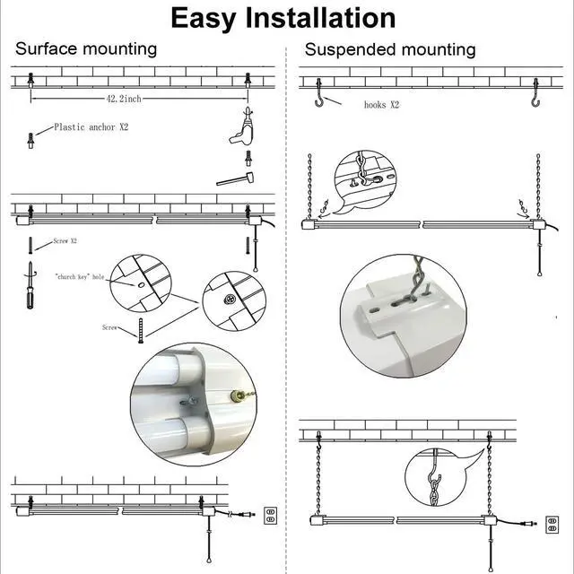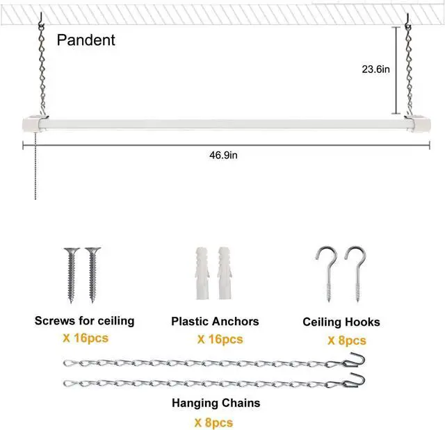 Easy installation: provide hassle-free installation and easy daisy chain for your convenience. Suspended mounting and Flush mounting are both available, the screw holes at frontage of the light make flush mounting easy. Use aluminum material as light body, make light stable/good heat dissipation but not heavy, Uses plug connection to link up multiple lamps MAX 10pcs in a line. Hanging hardware and instructional manual included for an easy installation.