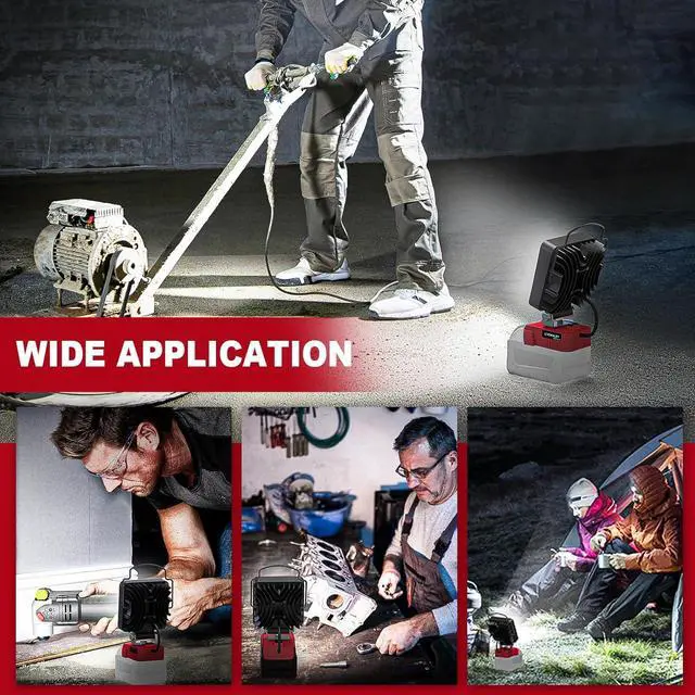 WIDE APPLICATIONThe angle of the flood light head can be adjusted 140 degrees, which is perfect for jobsites, outdoor events, camping, hiking, vehicle maintenance, and many other situations, providing you with an efficient lighting solution.