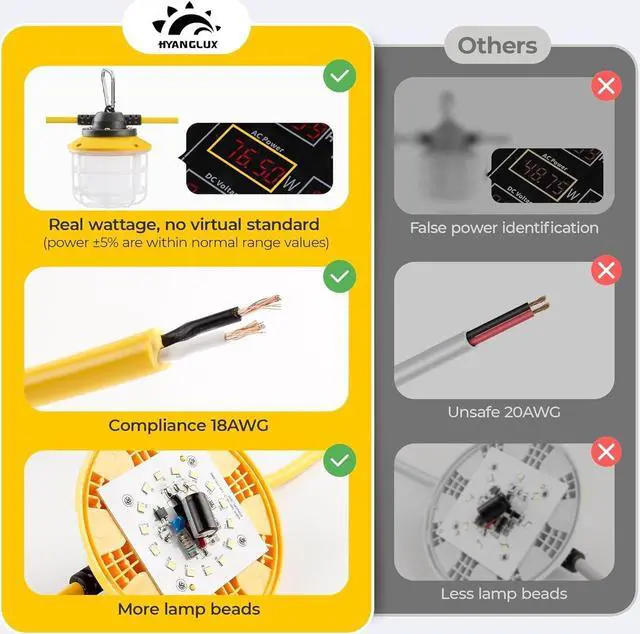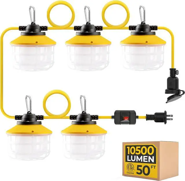 Contractor-grade Ultra-high Brightness & True color: Hyanglux construction light strings provide up to 2100LM of luminous flux with only 15W per LED light. With luminous efficiency of 140LM/W. A complete set of 5 lights, up to 10500LM. 5000K white sunlight, with a color rendering index of over 80, you can see any item clearly without color difference. Its excellent light efficiency will save a lot of electricity, making it an excellent green lighting choice