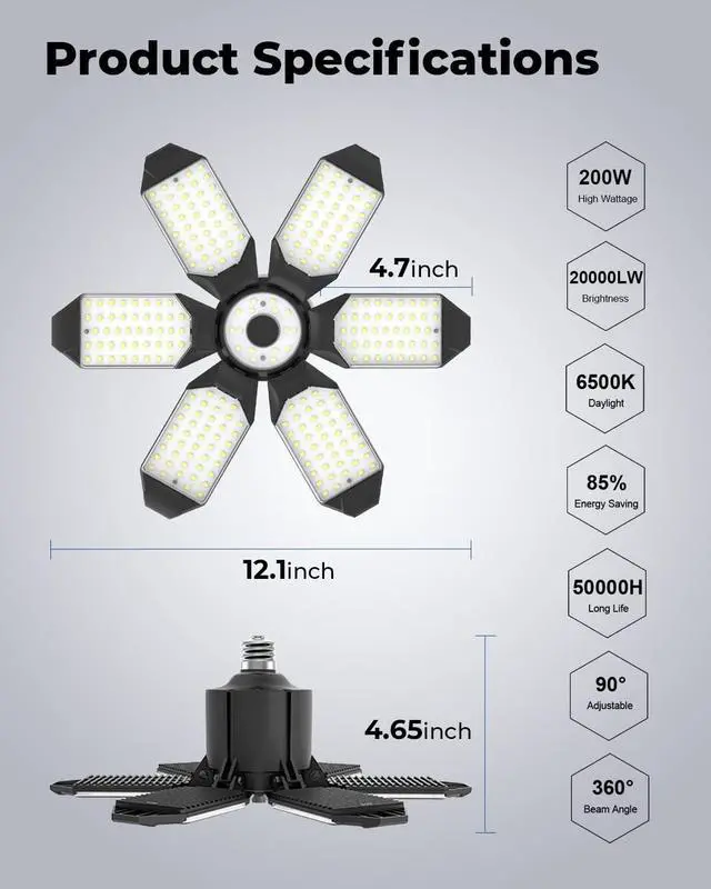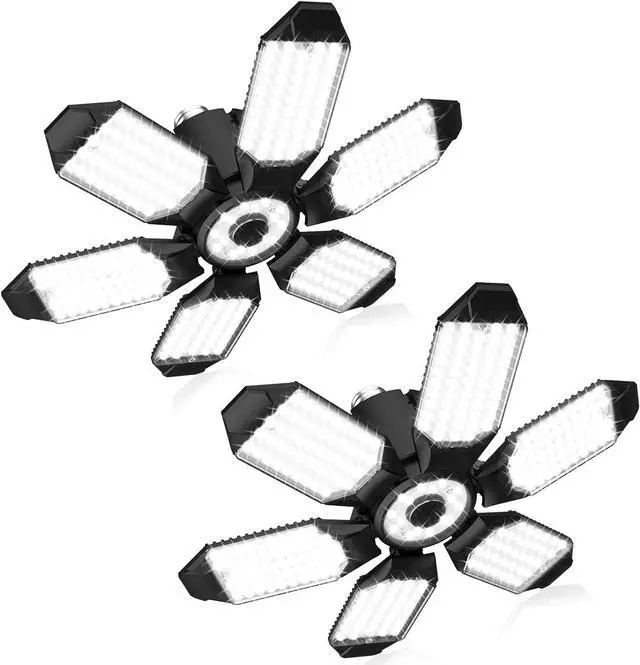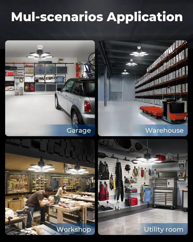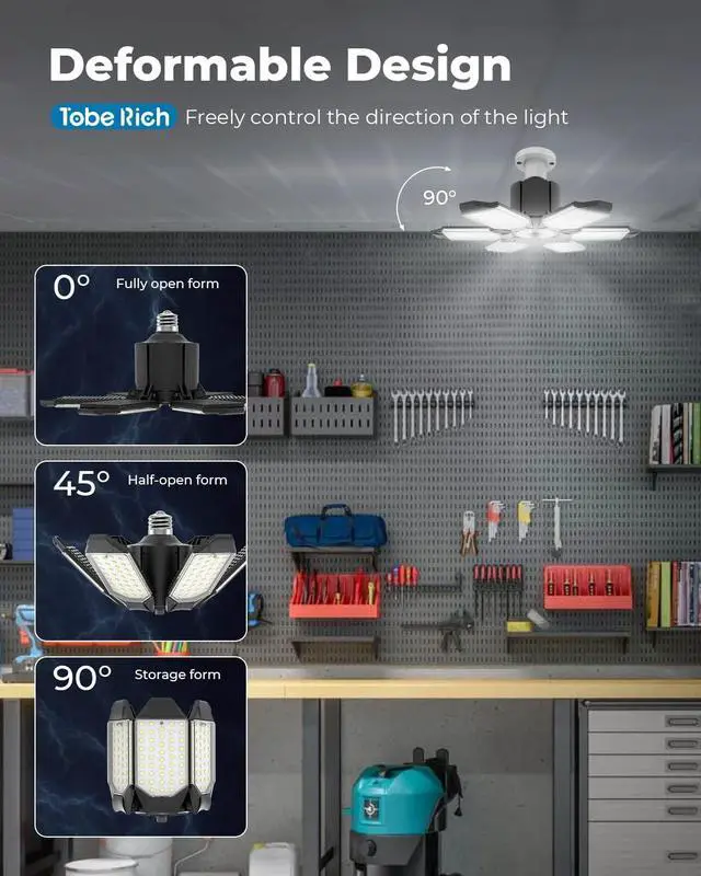 : Our deformable garage lights feature adjustable panels that can be angled up to 90 degrees, allowing you to customize the direction of your lighting to suit your needs. Besides, with a wide-angle and multi- panels design, these garage LED lights provide broad coverage, illuminating even the darkest corners of your garage or workshop.